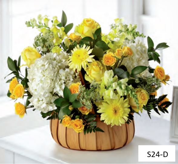 The basket design is filled with yellow and supporting white blooms and greens to add contrast.