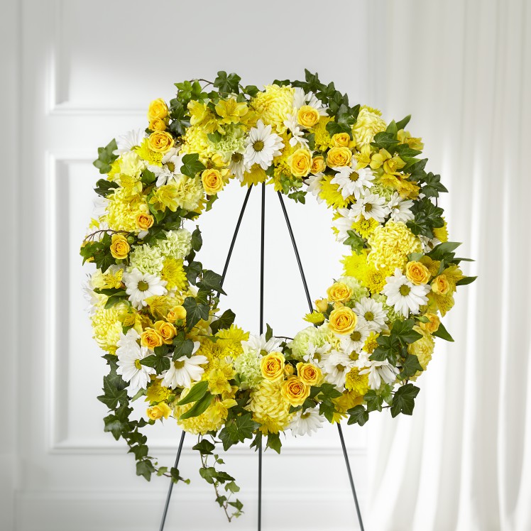 This wreath is filled with yellow blooms and adds a dash of white and supporting greens to add contrast.