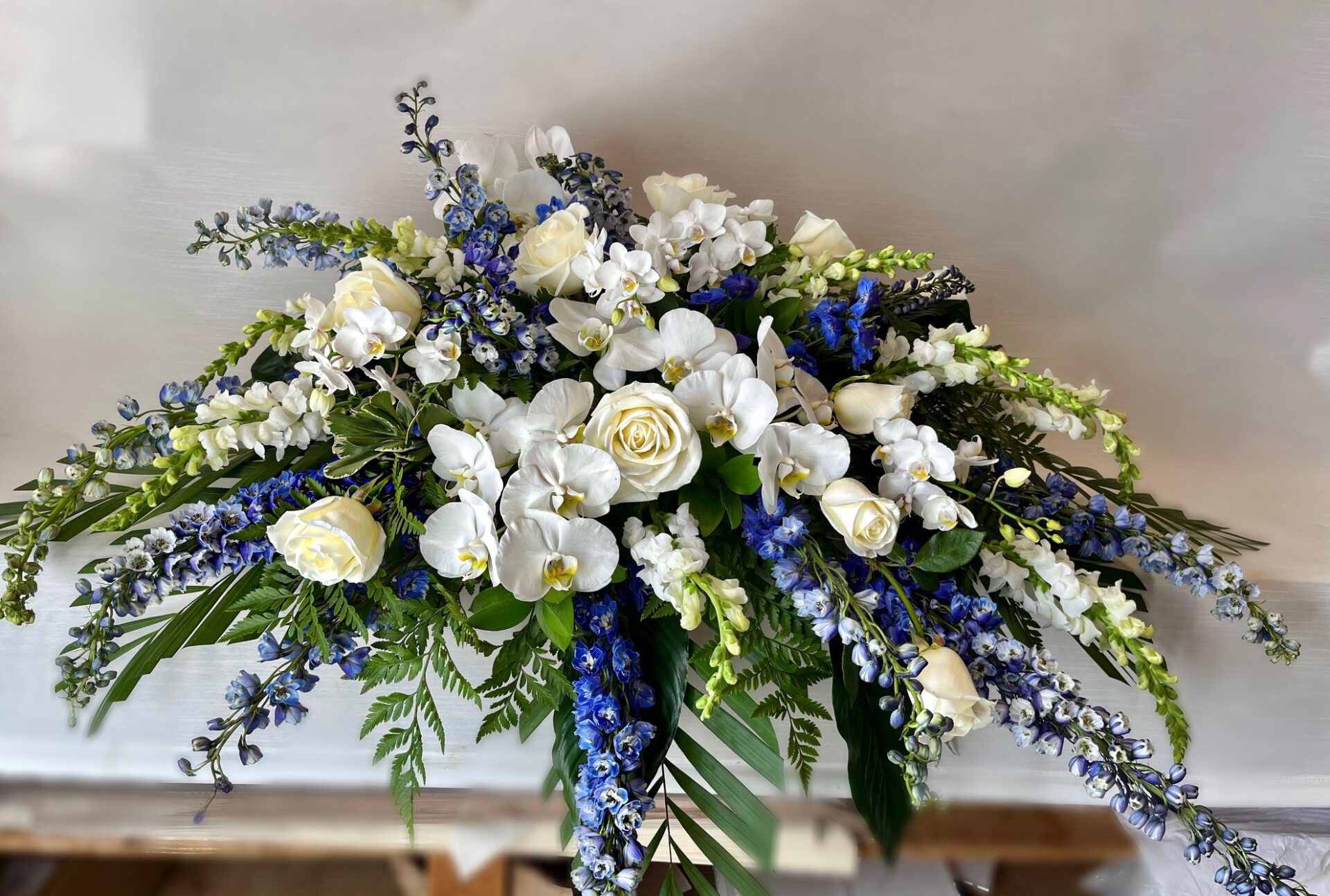 The larger Open Casket version is shown – Note: Larger Closed Casket Sprays Can be ordered for Open Casket Services …the funeral Directors simply shift the piece during service if required.