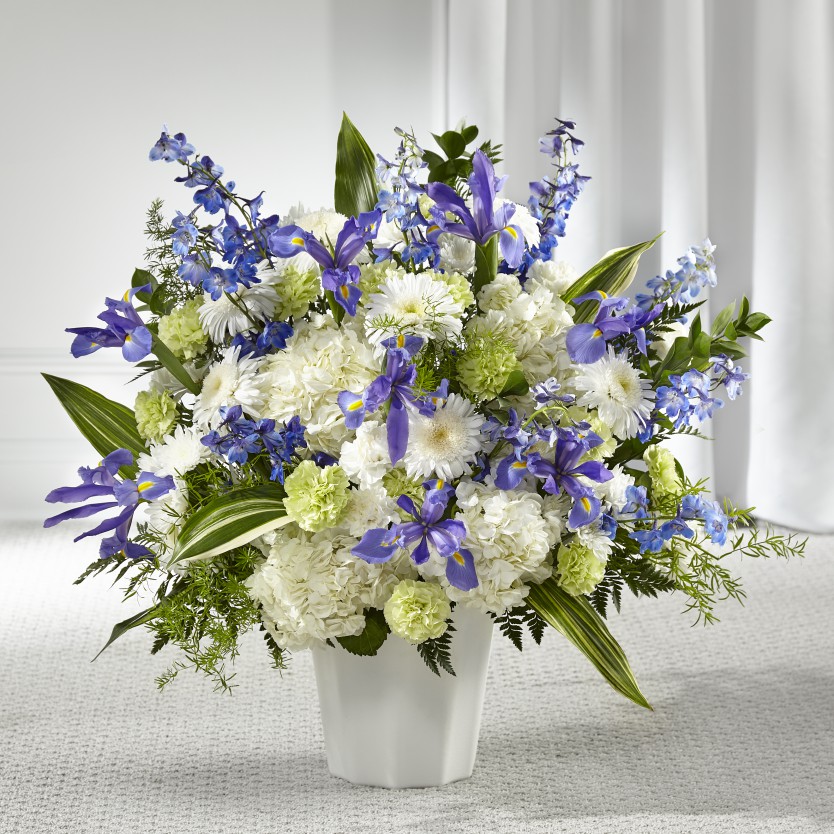 Blue flowers symbolize peace, tranquility, and inspiration, while white flowers represent purity, innocence, and new beginnings. Together, they convey a message of serenity.