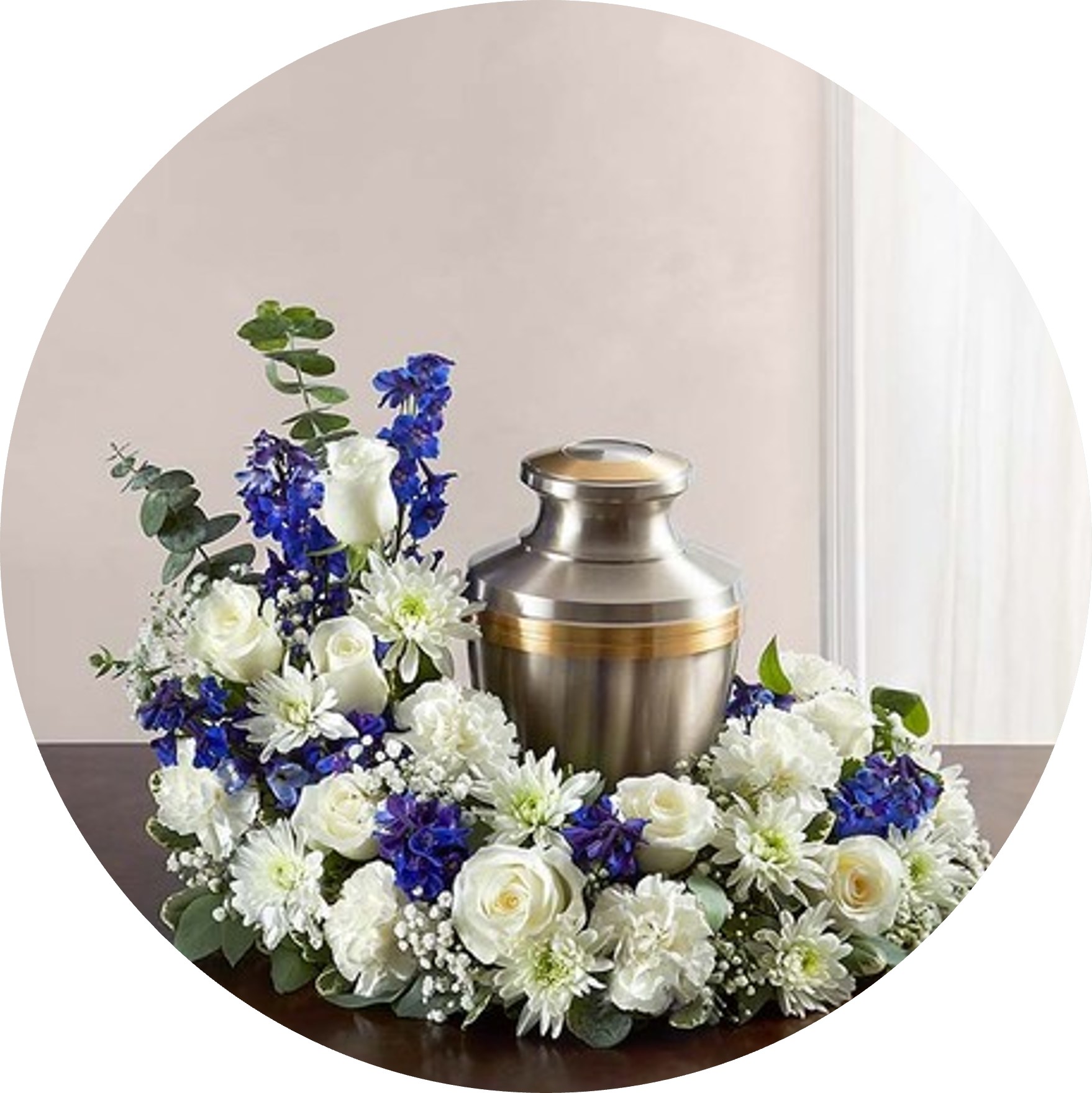They comes in 3 sizes to create just the right tribute no matter the size of the urn or budget. Note: Small only fits urns of approximately 5 inches diameter or less. Wreaths can be created in a half-round shape as well if budget is limited. Please let us know your urn diametor/dimensions, so we can adjust the fit.